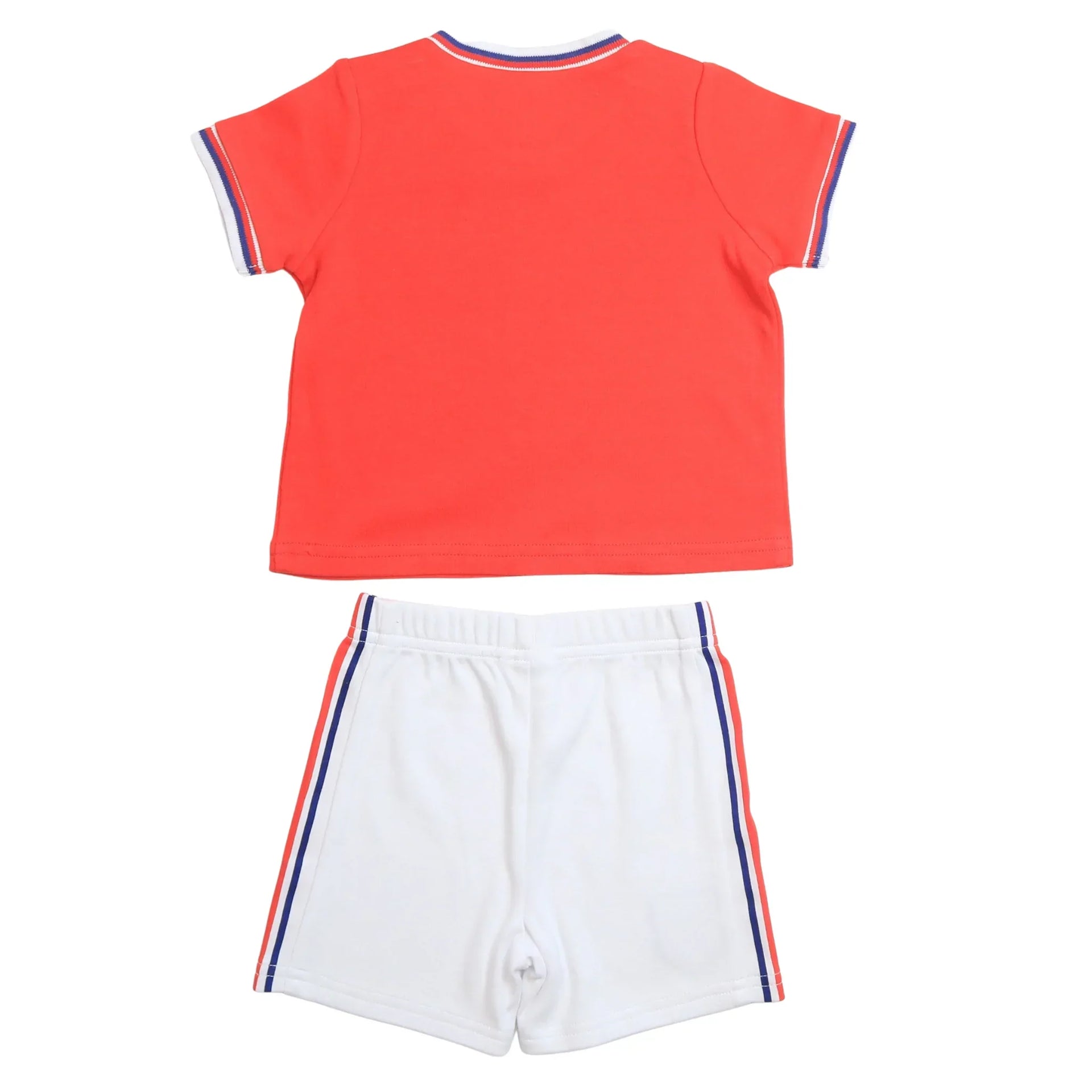 This official licensed England Football infant T-Shirt & Shorts set is a replica of England's 1982 World Cup Finals Away kit. In 100% cotton and with popper fasteners to the neck (up to age 12-18m), it is super soft and easy to get on and off, perfect for little ones. The shorts have an elasticated waistband for comfort and the Three Lions woven badge sits proudly to the chest and to the shorts. An essential item for mini England fans and makes a thoughtful baby gift too.